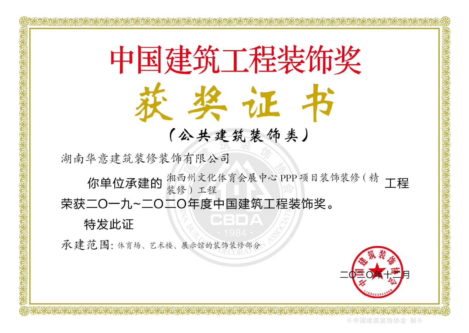 裝飾獎(jiǎng)--湘西州文化體育會(huì)展中心PPP項(xiàng)目裝飾裝修(精裝修)工程