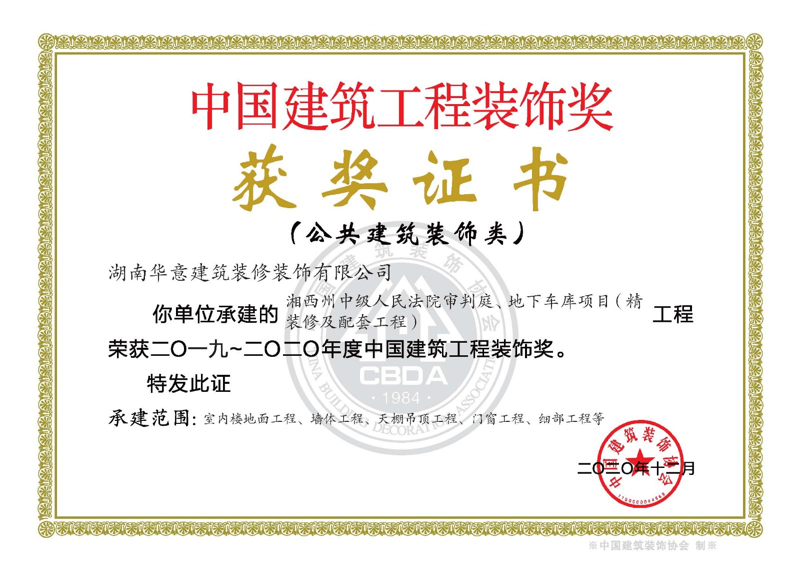 裝飾獎(jiǎng)--湘西州中級(jí)人民法院審判庭、地下車(chē)庫(kù)項(xiàng)目(精裝修及配套工程)